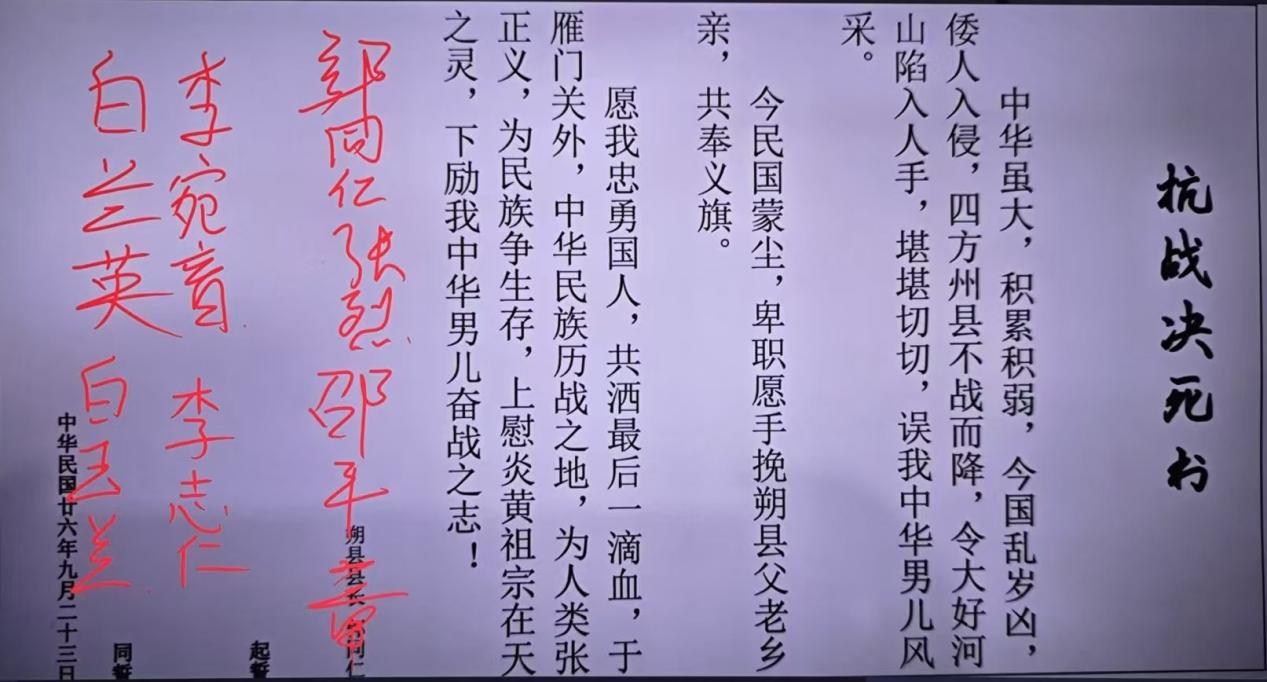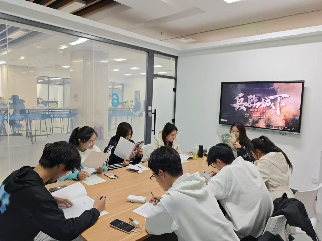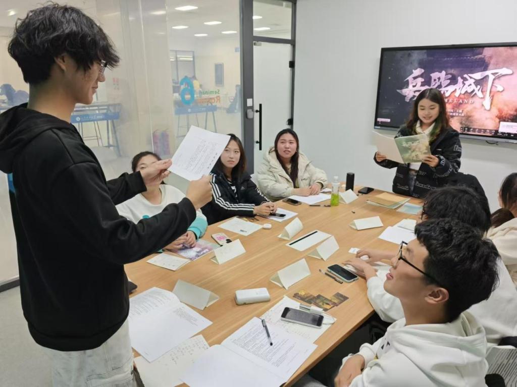 《兵临城下》剧本选自真实历史事件——山西朔县屠城惨案。同学们分别化身忠心为民的郭同仁、情感细腻的白玉英、性格刚烈的张烈等人物,通过沉浸式演绎、互动交流、推理探讨、线索交互、搜证等环节,“穿越”到硝烟弥漫的年代,在一轮轮博弈、一次次转折中,亦或以死明志,亦或忍辱负重……以不同的方式共赴家国使命,在主持人的引导下,“玩家们”在“抗战决死书”上毅然决然地签下名字,与革命先烈作出了同样选择,现场氛围达到高潮,同学们潸然泪下。