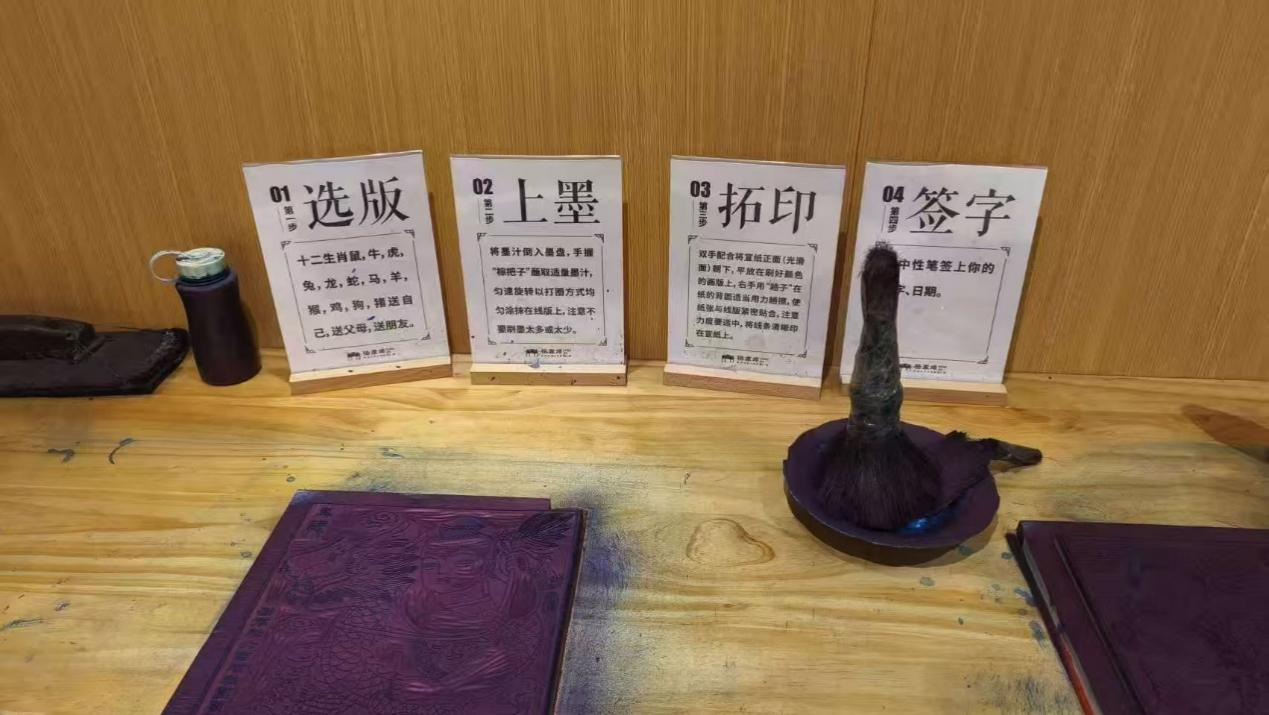 在杨家埠民俗大观园,工作人员现场演示了“勾描—刻版—套印”,令团队成员们身临其境感受到了匠心独运,切磋琢磨的三位一体制作工艺。通过解读年画中“福禄寿三星”“门神镇宅”“连年有余”等典型图式的文化象征,成员们发现其构图语言生动巧妙,再现了齐鲁大地的农耕文明与民俗传统。在中潍年画展示馆,工作人员向实践团讲解了杨家埠木版年画的制作工艺,包括画师构思绘制线稿、雕刻艺人雕琢线版与色版、印刷时的套印及手工补绘细节等。同时,实践团成员亲身实践了印刷过程,在专业人员指导下,体验了蘸墨、刷版、铺纸、压实等步骤,深感其背后蕴藏的深厚底蕴与艰辛付出,每一道工序都饱含岁月沉淀与匠人心血,绝非“一日之功”,更加钦佩年画传承人的高超技艺与坚守精神。