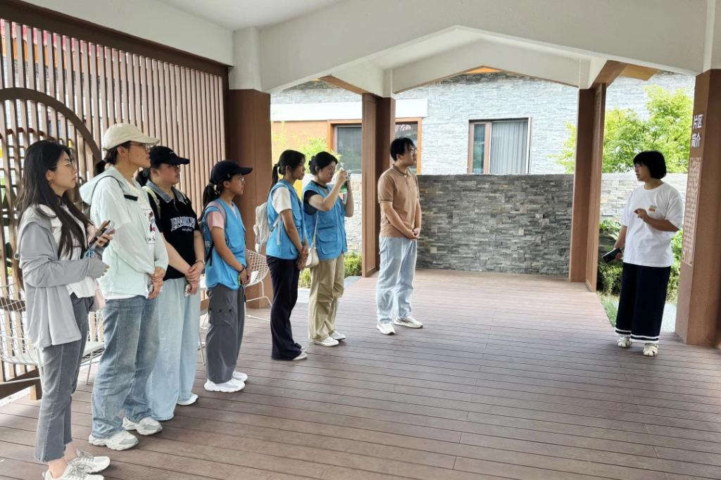 实践团队首先走进耕读学堂,通过讲解,成员们了解到这座 1700 平米的乡韵精品民宿,依托张家楼街道西石岭村闲置用地打造而成,集创业孵化、耕读研学、养老助餐、民俗体验等功能于一体,成为都市田园轻度假目的地。它不仅是传统“耕读传家”文化的现代表达、乡村闲置资源活化的典范,更成为让村民在家门口实现增收的“致富站”,为都市人寻找放松、为乡村留住人才搭建了双向桥梁,有效带动了当地村集体收入和村民就业。