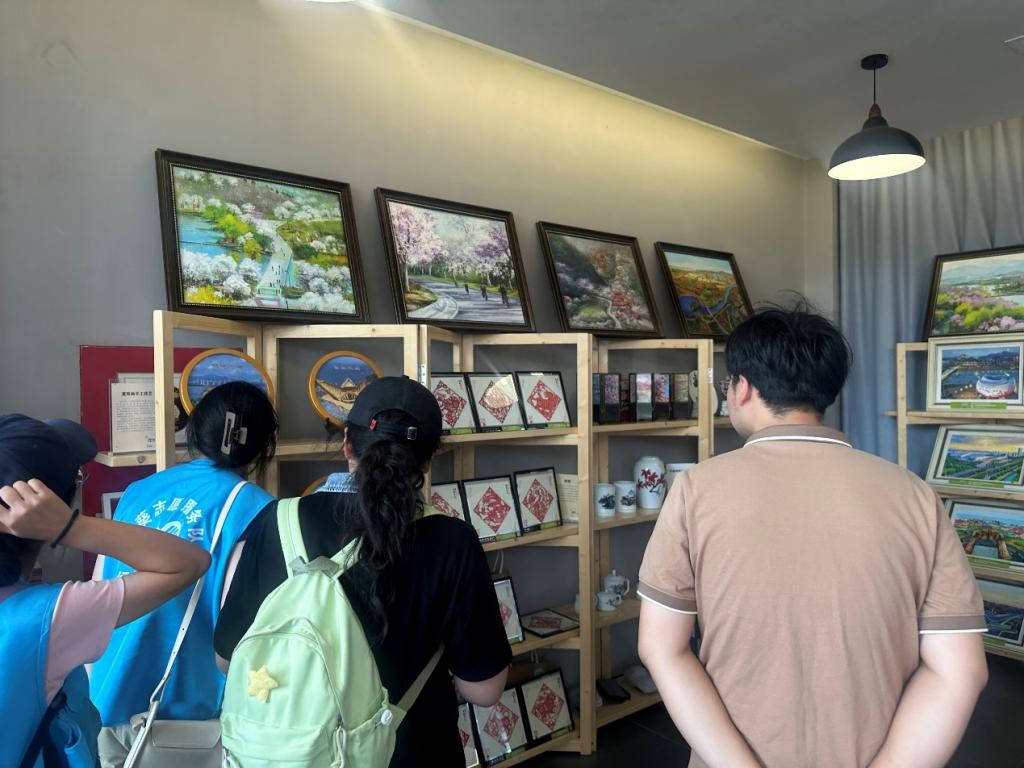 在乡忆工坊,陈列着具有鲜明乡村特色的农文旅及非遗产品。在讲解员的介绍下,团队成员深入了解了当地的蓝莓汁、明日叶、编织、油画等相关特色产品。这些产品大多源自当地农户与手工艺人,既保留了乡村物产的天然特质,又融入了传统技艺与现代设计理念,成为展示当地农文旅融合发展成果的重要窗口。
