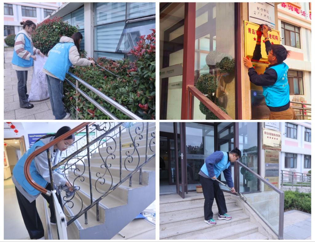 志愿者们分工明确,通力协作,清扫整理公共区域的落叶和杂物,细致擦拭了室内玻璃与楼梯,致力于为老人营造洁净、温馨的居住环境。
