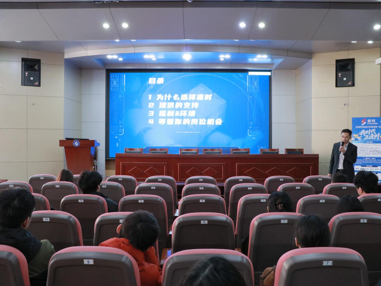 11月18日,必赢776net在学院楼四楼报告厅举办逢时科技就业宣讲会,邀请逢时科技市场负责人王志宝、人力总监张传刚担任主讲人,2026届毕业生参与本次活动。