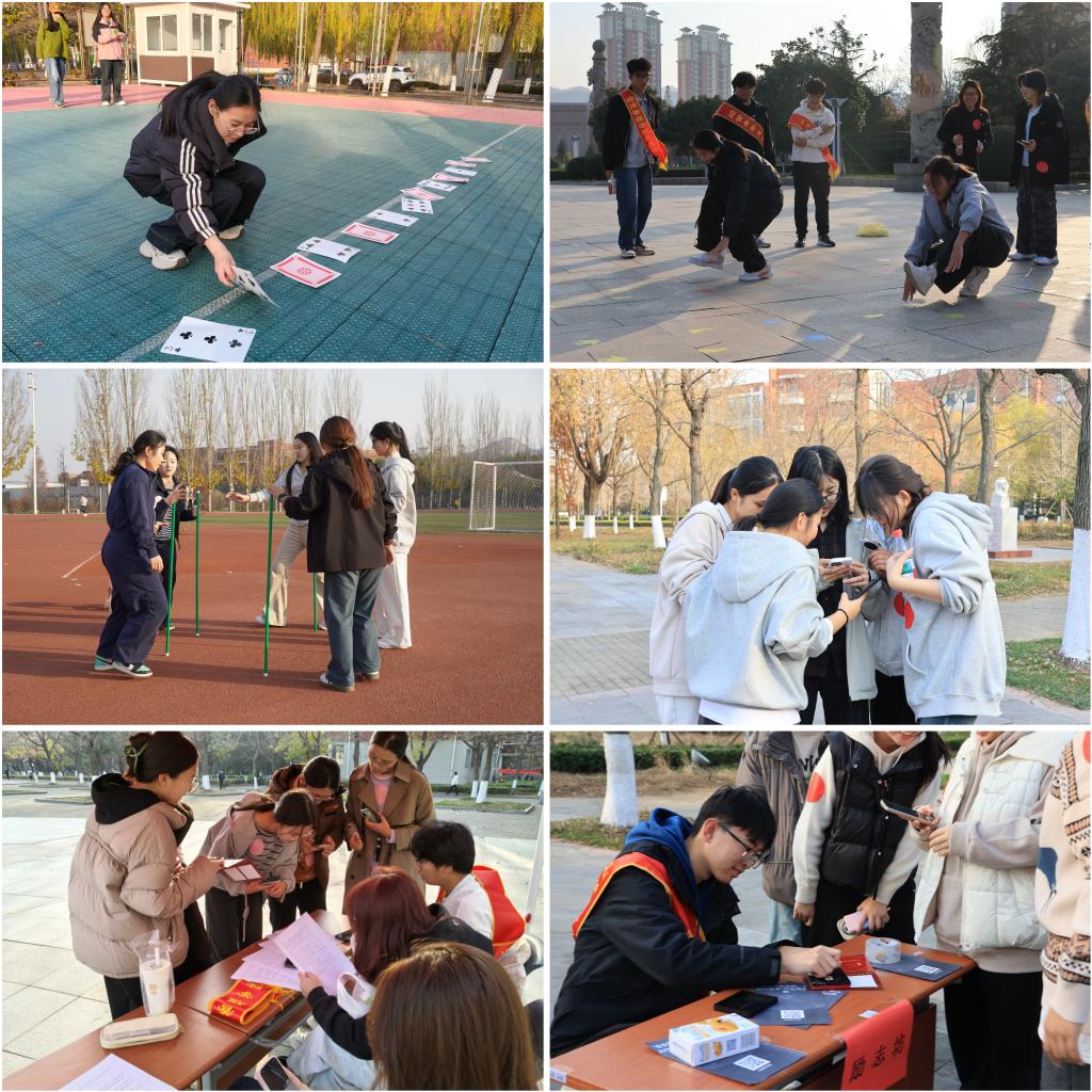本次游园活动共设高地篮球场、高地操场、繁星广场、励志坊、泰山广场、小西湖排球场六个场地,各站点围绕红色教育主题,设计了融思想性与趣味性于一体的特色任务。“淬炼砖程,协作争先”海绵砖挑战赛与“五芒接力,砥柱前行”不倒森林项目将体育竞技与团队协作相结合,展现了同学们坚韧不拔、紧密团结的优良风貌;“红心聚力,手脚协作”挑战赛与“薪火递序,牌定乾坤”纸牌接力赛则考验参赛者的逻辑推理能力与体能素养;“智启题途,史地寻踪”限时问答赛与“问卷征程,全员智闯”答题挑战进一步深化了同学们对红色历史的认知,凝聚起“学史明理、学史增信、学史崇德、学史力行”的青春共识。