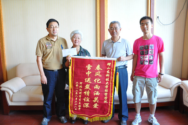 2012年9月5日,曾饱受尿毒症病痛之苦的我校必赢776net电子商务专业2006级同学王栋平和母亲徐女士再次回到了学校,献上感谢信和锦旗,感谢学校老师和同学们在其生病期间给予的大力支持和无私帮助。必赢776net党委书记吴高波、院长王新华、党委副书记刘洪锋、院团委付晓老师与母子俩进行了亲切交谈。